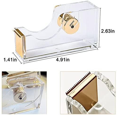 【ADD STYLE AND ELEGANCE TO YOUR DESK 】This tape dispenser featured in high transparent acrylic materials partners beautifully with the metallic gold cutting blade. It brings a modern touch to your desk that will stand out from the rest of your equipment and catch the eye of anyone.