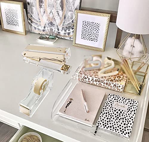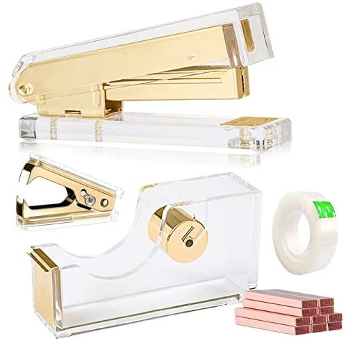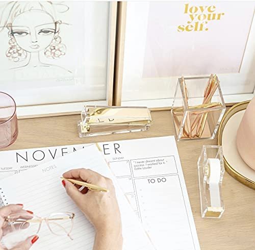 【DURABLE QUALITY】 High-end contemporary heavy duty acrylic and gold toned metal material, quality is better that usual plastic, translucent as glass, naturally elegant and beautiful, sturdy and durable office stationery set for daily use; Combining with both beauty and function, the well-designed tape dispenser is built to last.