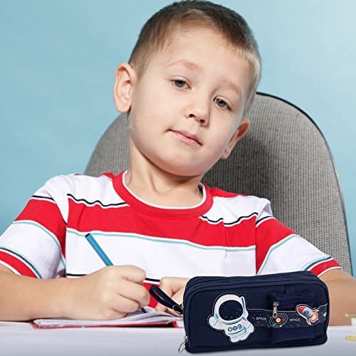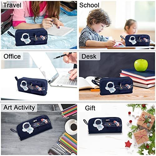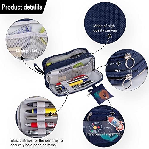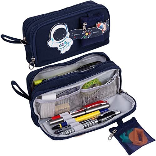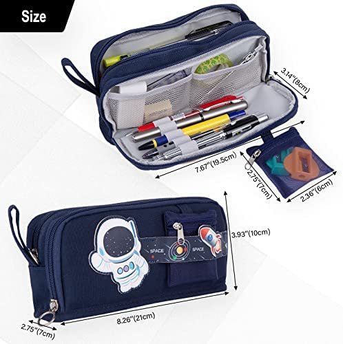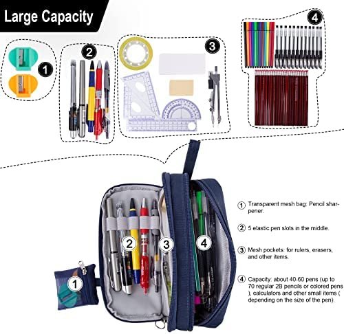 【Large capacity】Size 8.5 x 4.1 x 3 inches with large capacity storage. It have 2 compartments. Main compartment can easily hold up to 50 pens or 90 pencils. Secondary compartment has 2 mesh bags , small stationery can store in it , such as Rubber, Sticker ; and has 1 elastic strap, it can store a few pens that are often used. Outside the pencil case , there is a small bag for storing pencil sharpeners.