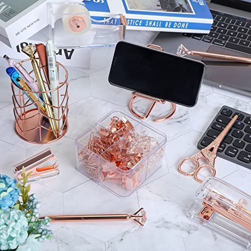 Desk Accessories, Office Supplies for Women of Stapler, Staple Remover, Tape Holder, Pen Holder, Staples, Phone Holder, Diamond Pen, Ruler, Scissors and Binder Clips, Desk Decor for Office (Rose Gold)