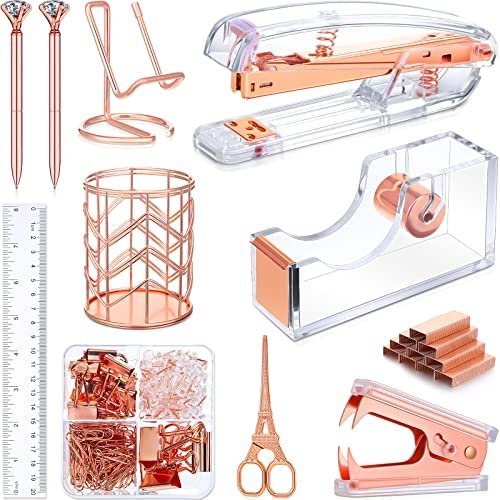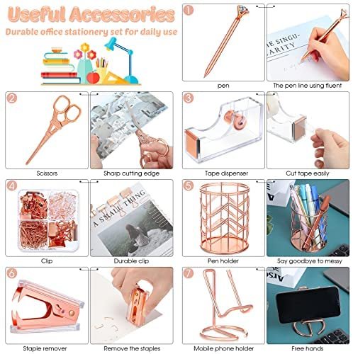 Packing Listing: you will get a set of desk accessories, which includes 1 stapler, 1 tape holder, 1 staple remover, 1 pen holder, 1 box of staples, 1 mobile phone holder, 2 diamond pens, 1 ruler, 1 scissors and 1 box of binder clips; This set can meet your needs in daily life and work