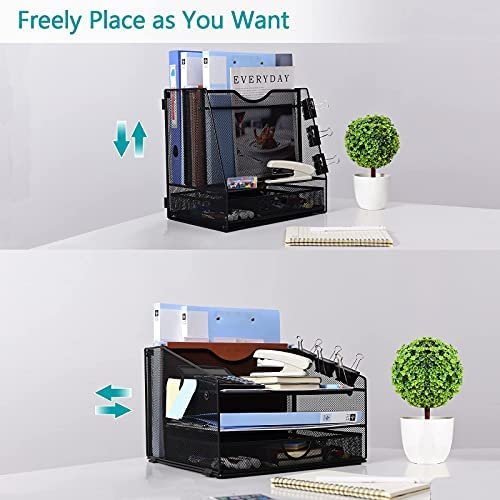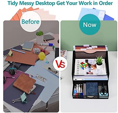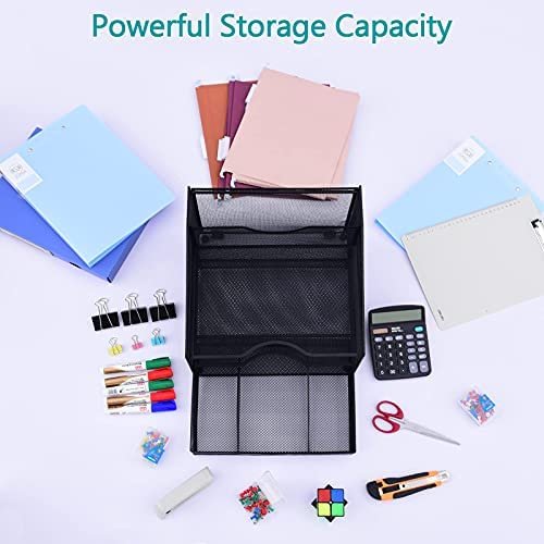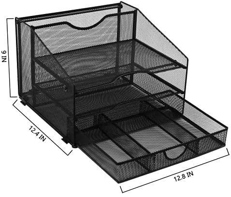 desk organizer and office supplies—【POWERFUL STORAGE CAPACITY】— the mesh office supplies organization has 4 compartments and 1 sliding drawer can accommodate various things on the desktop (A4 paper, notebooks, folders, books, magazines and other office supplies). Make your desktop more tidy and provide you with a convenient and comfortable office environment.
