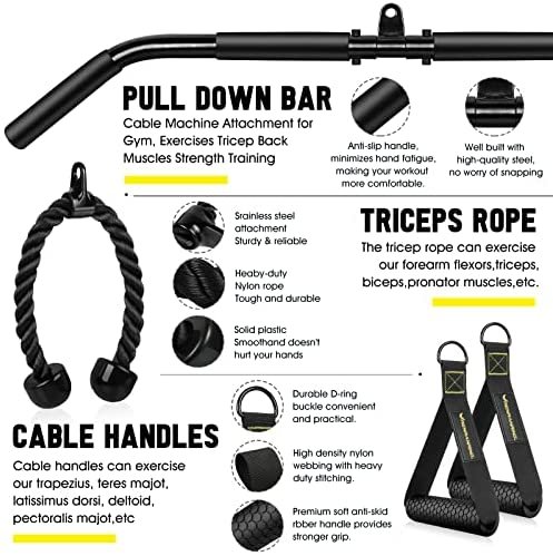 RENRANRING pulley system unlock a multitude of upper body exercises and allow for different holds when using cable machines that encourage perfect body-positioning for each individual exercise, as well as targeting specific muscles.Perfect for building stronger triceps and grip strength, assisting muscles around triceps, biceps, elbows, wrists, back, abs and shoulders with different compound pushing exercises