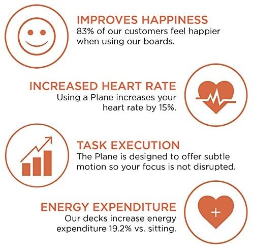 FITNESS BY THE NUMBERS Compared to sitting behind a desk, the Balance Board increases your caloric burn by 19.2% and increases your heart rate by 15%. Standup desks engage only the quad and calf muscles. With the deck, you’ll feel your core and glutes get a workout, too. With a 360° tilt, your range of motion expands for natural, continual use. Step away from your workstation chair or any sedentary responsibility and transform the way you move with our premium The Plane Balance Board.