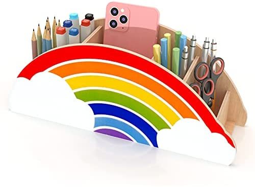 Gamenote Wooden Pen Holder & Pencil Holders – Rainbow Supply Caddy Phone Holder Desk Organizer for Office Supplies Makeup Brush Classroom Organization for Women & Kids