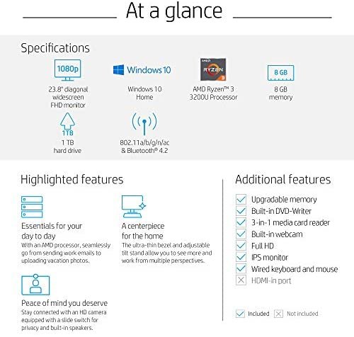 With an AMD processor and 8 GB of RAM, seamlessly go from sending work emails to uploading vacation photos. This all-in-one PC displays more with an ultra-thin bezel and has an adjustable tilt stand, allowing you to work from multiple perspectives. This PC includes an HD camera with a slide switch for privacy, Plus built-in speakers and easy Wi-Fi connectivity. Now, you can stay in touch with family and friends while maintaining Peace of mind.
