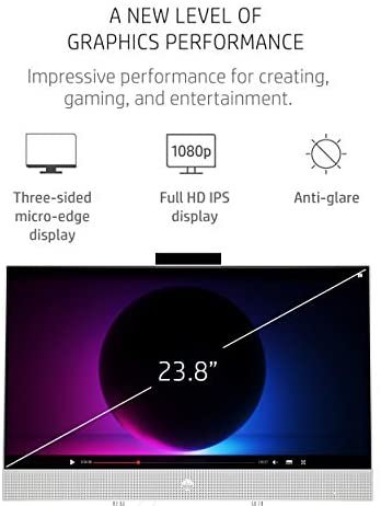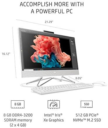 Think long term The HP All-in-One PC blends the power of a desktop with the beauty of a slim, modern display into one dependable device designed to grow with you. With easy upgrades in three simple steps, you can feel confident your tech will stay up-to-date. Built for tomorrow Looking for a powerful All-in-One PC that can easily grow with you? Keeping technology up-todate has never been simpler. Designed with a panel you can remove in three simple steps, easily upgrade your hardware to ensure you always have the power to get things done. Power of a tower Tackle your busiest days with the performance of a reliable processor. Save more of what you love with abundant storage for all your photos, videos and documents. We’ve got your back For 80 years, we’ve had your back. Trusted by millions of customers, the HP brand puts dependable technology above all else. That’s why our PCs go through over 230 individual tests to ensure you’re getting a powerful, reliable PC that’s going to last. Featuring Windows 10 Do great things confidently with the familiar feel of Windows – only better. Exceptional experience, anywhere 11th Gen Intel® Core™ processors bring the perfect combination of features to make you unstoppable. Get things done fast with high performance, instant responsiveness and best-in class connectivity. Intel® Iris® Xe graphics Impressive performance for creating, gaming, and entertainment. A new level of graphics performance and crisp, stunning visuals – with the convenience of a thin & light laptop. PCIe SSD storage Boot up in seconds with lightning fast speed with up to 512 GB PCIe SSD storage. DDR4 RAM Designed to run more efficiently and more reliably at faster speeds, DDR4 is the future of RAM. With its higher bandw