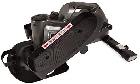Two great machines in one. Ideal for people who are sitting a good portion of the day. Sitting for long periods of time is not the problem, it’s being stationary while standing or sitting that creates problems. The mini elliptical will fit comfortably under a desk and you can get your legs moving while typing, talking on the phone, or reading. Want to turn up the workout while on break, switch into stand up mode, add some arm weights and burn even more calories. Burns up to 300 calories while sitting and even more while standing. Converts easily from stand up to sit down mode. Easy to move with a top handle, a front handle and rear wheels.