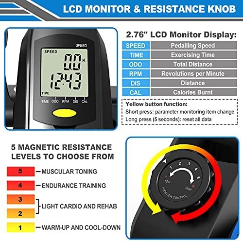?【5-Level Magnetic Resistance & Easy-read LCD Display】The desk cycle bike pedal exerciser comes with 5 adjustable levels of magnetic tension based on your needs (Recommended using time: ≤ 30 min one time in case fatigue). The high-quality mini exercise peddler tracks your SPEED, TIME, ODO, RPM, DIS, CAL, easy to read.