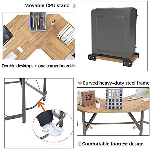 [L-Shaped Design] Double Wide desktop of E1 degree solid particle wood with high resistance on scratch & friction, space saving, provide plenty space for writing, working, handcraft, gaming and other activities.