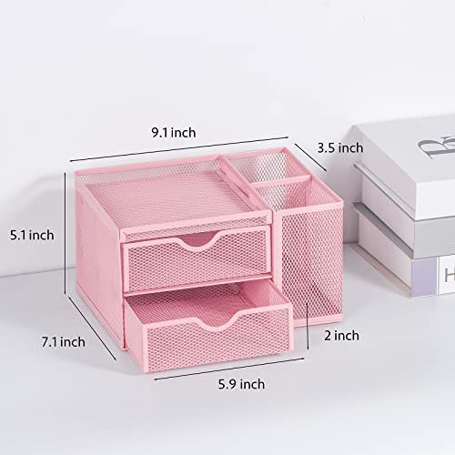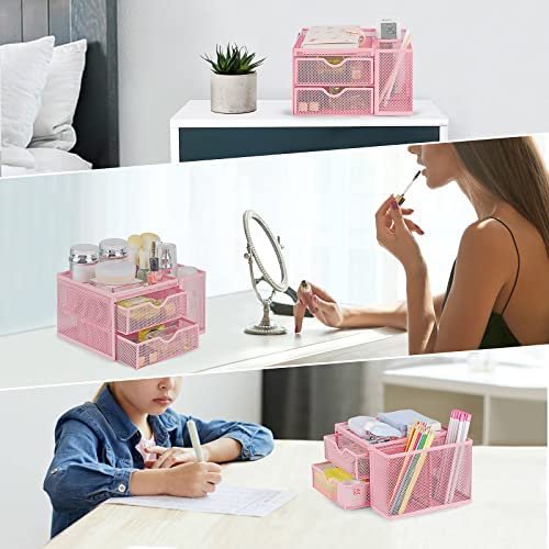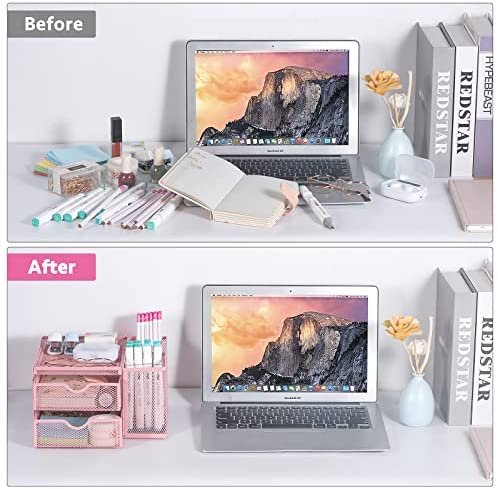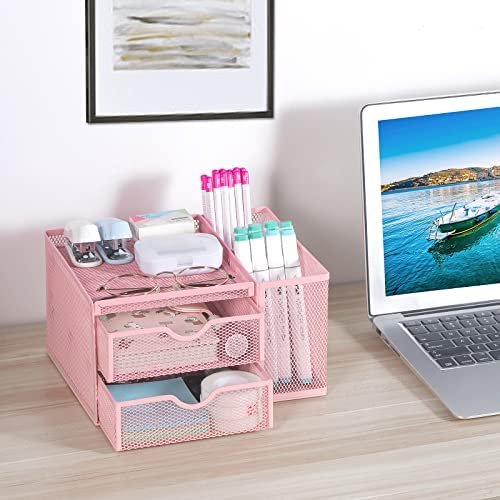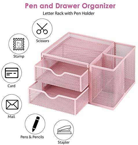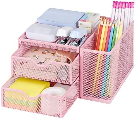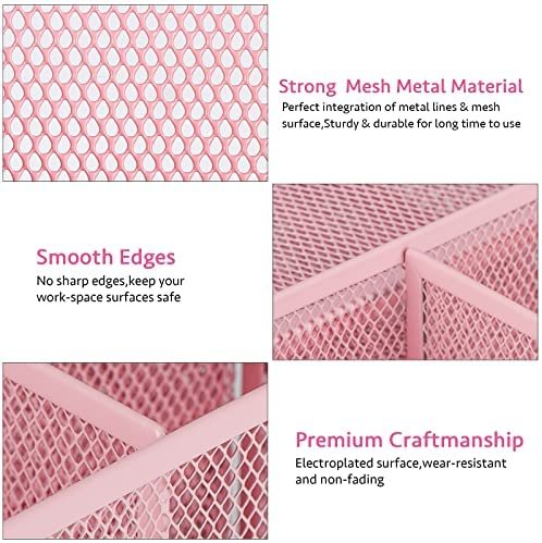 【Durable Color Desk Organizer 】: A lighter pink to match your desktop/ kitchen countertop and other stationery supplies, great deco to your desk, also it can make your desk look more fun. It’s completely made of metal, not cheap plastic (even the drawer) No rough edges, joins are secure, quality of metal mesh is strong.