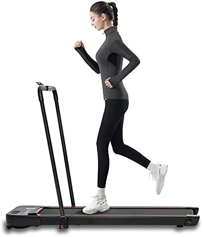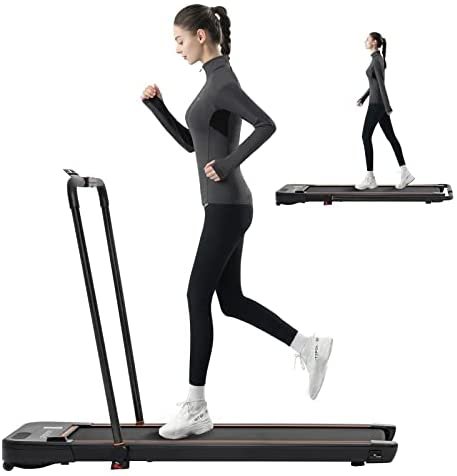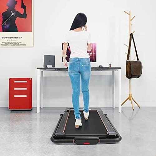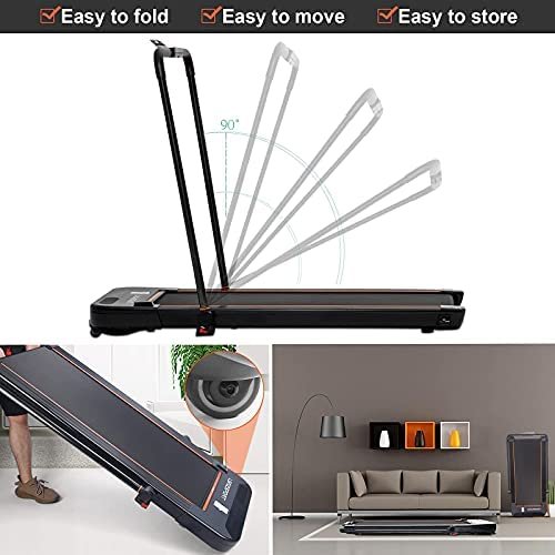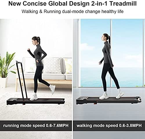 [2 IN 1 FOLDABLE TREADMILL] This 2-in-1 under desk treadmill has 2 modes: Running mode and Walking mode. In running mode, the speed is 0.8-12km/h. In walking mode, the speed is 0.8-6km/h controlled by the Remote when folded. It is convenient to change the mode and do the exercise you want.