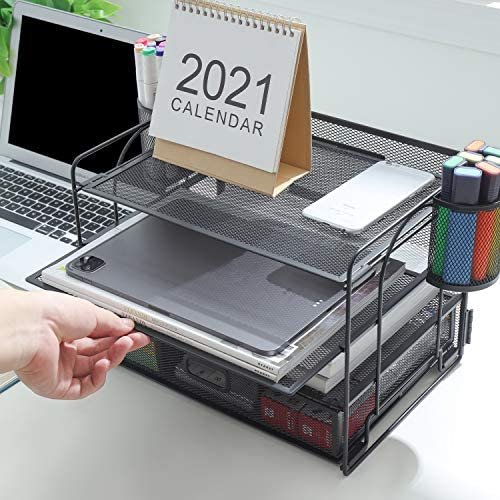 【Perfect Desktop File Organizer】Our Office Desk Supplies Organizer is made of 4 sliding trays + 2 Hanging Pencil Holders + 1 sliding drawer which has enough storage space to accommodate all office supplies, such as pens, pencils scissors, folders and Letter/A4 Size Paper