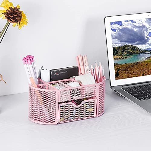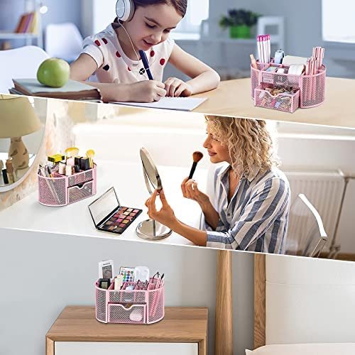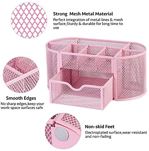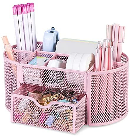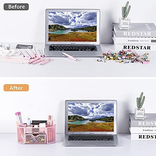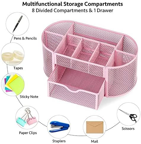 【Pretty and Durable Metal Desk Organizer 】: A light pink to match your countertop/ kitchen countertop and other stationery supplies, also it can make your desk look more fun. It’s completely made of metal, not cheap plastic (even the drawer) No rough edges, joins are secure, quality of metal mesh is strong.