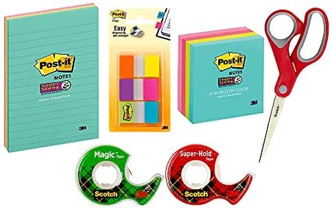 Make sure you have the basics close at hand to crush any work or personal organization challenge that might come your way. This bundle comes with a Post-it® Super Sticky Notes, Scotch® Brand Tape, Post-it® Flags and Scotchâ„¢ Precision Scissors for a complete kit to write down great ideas, find information fast and prepare to handle fixes on-the-go. The perfect essentials pack. Post-it® Super Sticky Notes have 2x the sticking power to make sure your note sticks where you need it. 3 in. x 3 in. size is great for reminders to yourself or others, while the 4 in. x 6 in. lined notes are great for to-do lists or longer messages. Scotch® Brand Tape is ideal to have on hand for mending paper tears, creating poster board projects, and labeling on surfaces like plastic, cardboard and metal. Use Post-it® Flags to mark important information and organize thoughts in books, planners, binders and more. Turn to Scotchâ„¢ Precision Scissors for high quality stainless steel blades for all your cutting needs. Pack includes 7 pads Post-it® Super Sticky Notes, one pack 3 in. x 3 in., one pack 4 in. x 6 in. lined, and neon colors. One pack Post-it® Flags, assorted colors, .94 in. wide, 60/pack. One roll Scotch® Magicâ„¢ Tape, 3/4 in. x 650 in. One roll Scotch® Super-Hold Tape, 3/4 in. x 650 in. One Scotchâ„¢ 8″ Multi-Purpose Scissors. Everything you need in one pack!