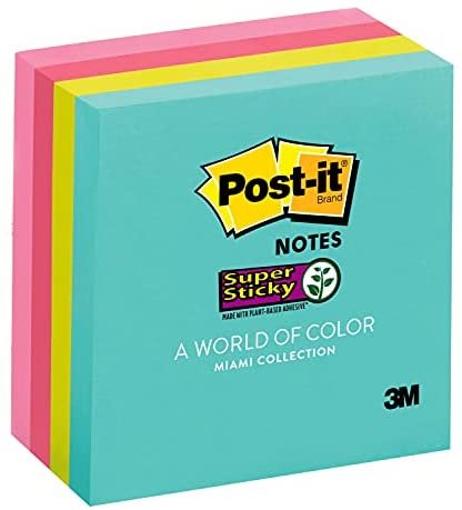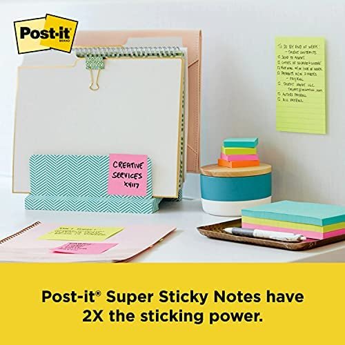 ESSENTIALS PACK – Includes seven pads Post-it Super Sticky Notes, one pack 3 in. x 3 in., one pack 4 in. x 6 in. lined, and neon colors.