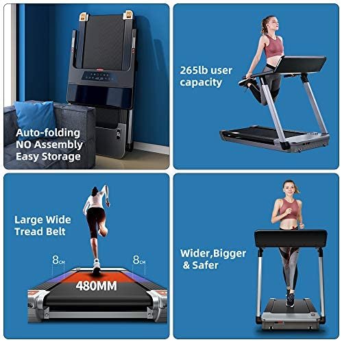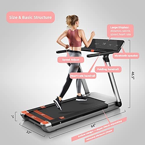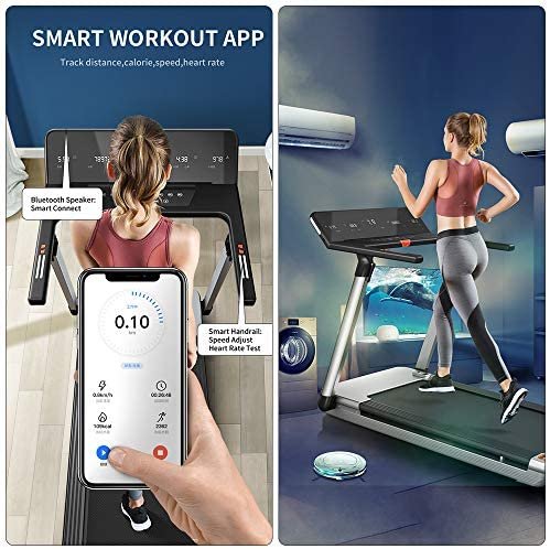 5.Heart Rate Foldable Handrail , Bluetooth Speaker, Smart workout APP—The multifunctional Foldable Handrail can bear 265lb user capacity , measure heart rate,adjust the speed, better control your walking & running thythm, much more safe! and,with bluetooth,you can listing music or watching TV when running & walking.and,monitor your Home Interactive Personal Training by smart workout APP.[Warranty]:Main Frame: 10 years; Parts: 1 year; Motor: 2 Years !