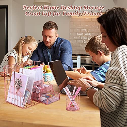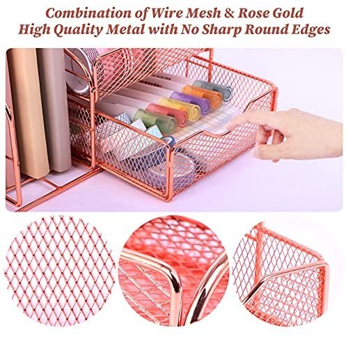 Rose Gold Desk Organizer with 6 Compartments, Mesh Metal Home Office Supplies Cute Pen Holder with Accessories, Magazine Notepads Storage Stationary Set for Women Girls