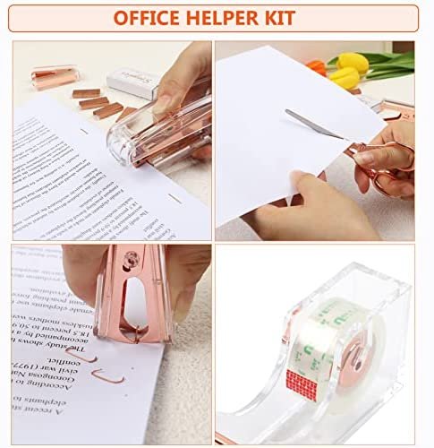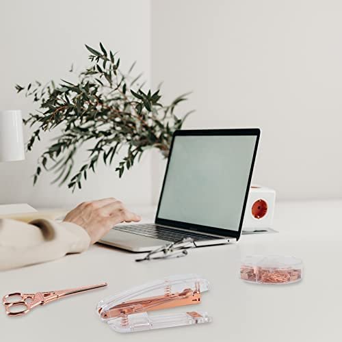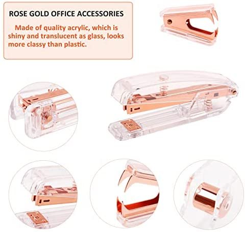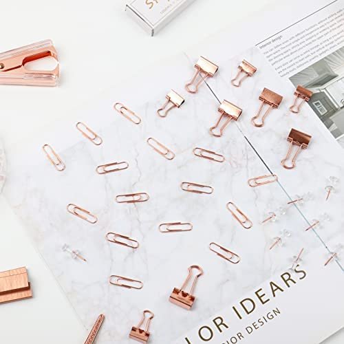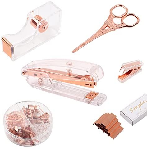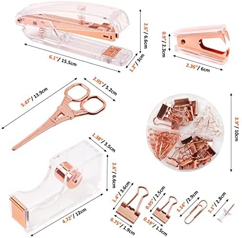 ?ROSE GOLD DESK ACCESSORIES INCLUDES — 1* Stapler , 1* Tape Dispenser, 1* Rose Gold Scissors, 1* Mini Stapler Removers, 7* 0.75″ Binder Clips, 15* 0.59″ Binder Clips, 30* Paper Clips, 20* Push Pins and 1000* Staples