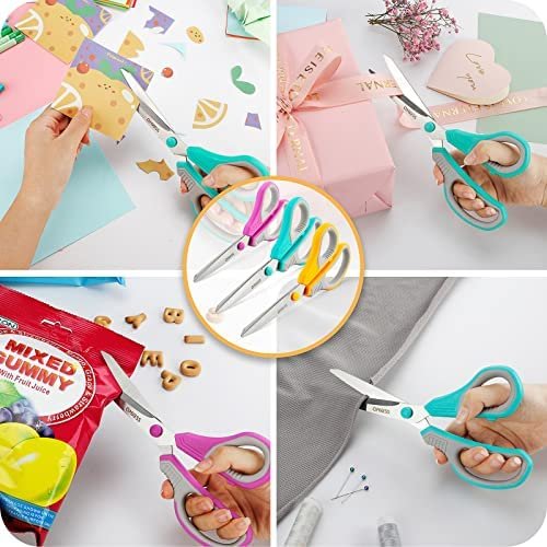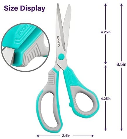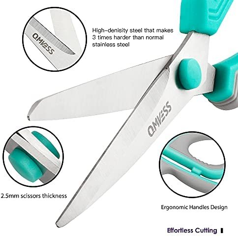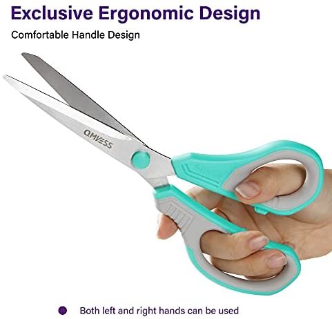 QMVESS 8.5 INCH SCISSORS: Great for cutting paper, cardstock, cardboard, wrapping paper, photos, tape, crafts, and everyday food packaging and opening boxes. Easily cuts patterns, garment cutouts, fabric, leather, fabric and other materials. These durable scissors can add fun to creating gift wrap.