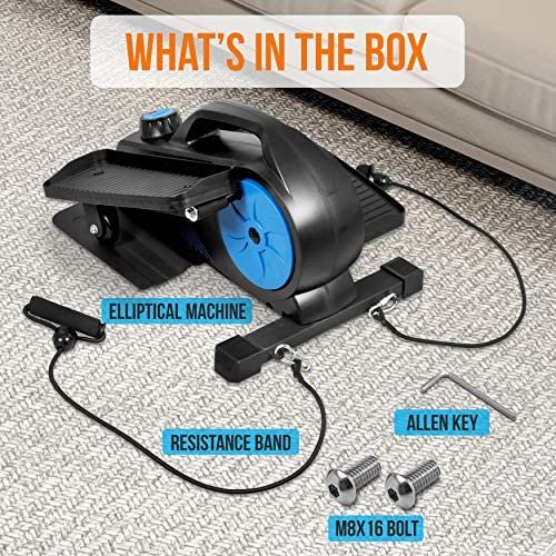 Features: – Display Monitor for Real-Time Progress – 8 Resistance Levels – Whisper Quiet with Smooth Gliding Motion – Quick and Easy Assemble up to 3-5 minutes – Carrying Handle for Easy Portability – Low-Impact Exerciser – Pedal Bike Cycle Motion – Lightweight, Durable and Portable – Ergonomic Design with Built-in LCD Monitor – LCD Monitor with 4 Functions: Time, Count, Calories & Total Count – Low Profile Elliptical Trainer – Stable, Safe and Simple to Use – Designed for Under Desk Use – Machine for Home and Office Workout – With Resistance Band for more Exercise Workout – Exercise while Working or Eating your Favorite Meal – Fits into Everyday Life, Office Desk, or Home Couch – Help People with Limited Mobility Looking to Revitalize & Build Muscle Strength What’s in the Box: – (2) M8x16 Bolt – (2) Resistance Band – (1) Allen Key Technical Specs: – Construction Material: Engineered ABS – Adjustable Resistance Levels: 8 Levels – Max. Weight Capacity: 300 lbs. – Monitor Requires 1.5V LR44 Magnetic Battery (Included) – Product Dimension (L x W x H): 23.62” x 16.92” x 11.81” -inches