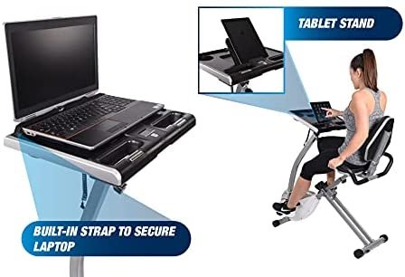 Desktop features laptop strap, cup holder, tablet holder, handles with Pulse sensors, and fitness monitor