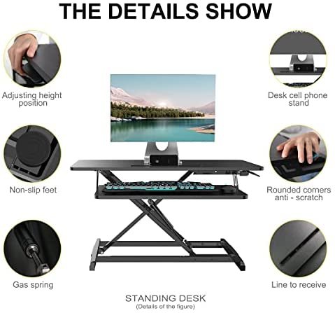 【Sturdy & Stable Material】Adjustable desk made with quality material:particleboard, heavy-duty steel SPCC frame, and melamine work surface; Desktop capacity 33 lbs , keyboard tray capacity 4.4 lbs; The rounded edges are also ergonomic and prevent scratches or irritation from hard edges.