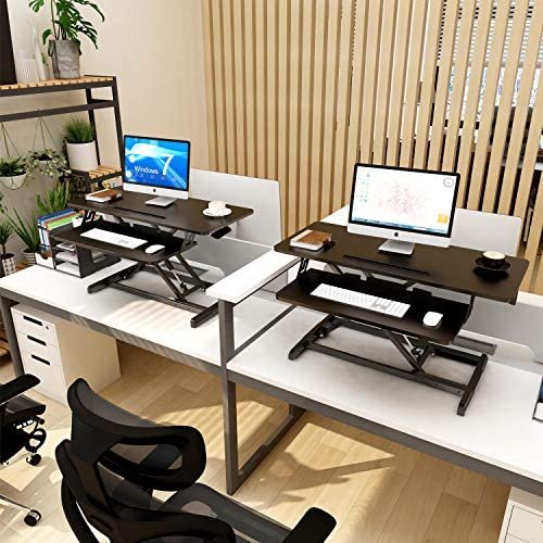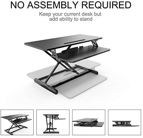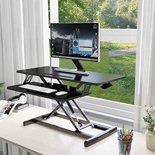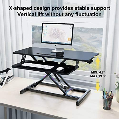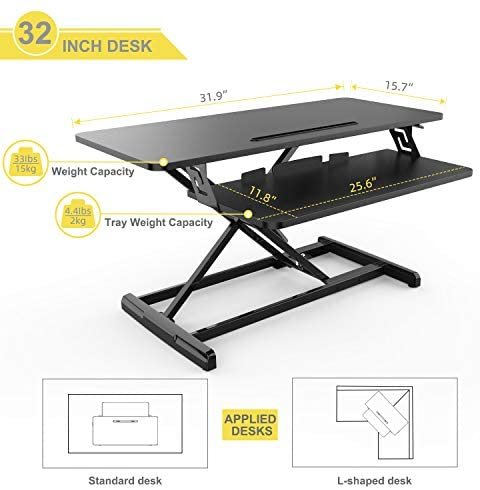 【Generous desk surface】 This sit stand desk design with 2-tier, have a spacious work surface measures workstation top dimensions: 15.7″ W x 31.9″ L; REMOVABLE KEYBOARD TRAY dimensions: 11.8″ W x 25.6″ L can easily accommodate a full-sized keyboard and mouse or laptop and mouse combo.