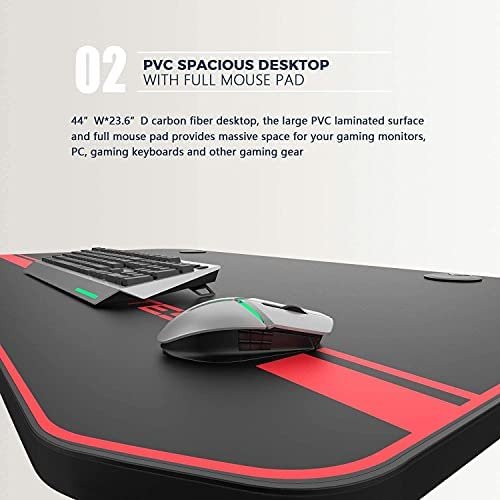 ★【SPACIOUS DESKTOP WITH FULL MOUSE PAD 】–40”W*23.6”D carbon fiber desktop, the large PVC laminated surface and full mouse pad provides massive space for your gaming monitors, PC, gaming keyboards and other gaming gear.