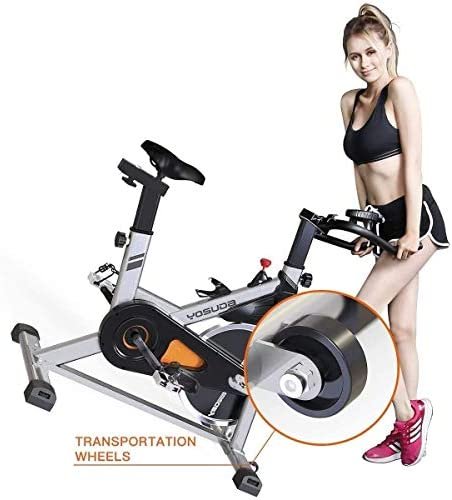 YOSUDA indoor cycling bicycle is a smooth, durable and easy to maintain bike designed to enable cyclists to exceed preset limits. In addition to its sturdy steel frame and nearly silent belt drive, the YOSUDA cycling bike features many customizable settings. It is decked out with a 35 lbs flywheel, LCD monitor and water bottle holder. 2-ways adjustable handbar and 4-ways seat provide cyclists feel comfortable riding. Transportation wheels make it easy to move. Maximum user weight: 270 lbs.